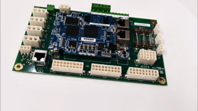 The bottom of the board includes two connectors, multiple capacitors, resistors, and diodes, as well as several integrated circuits, jumper switches, and test points.